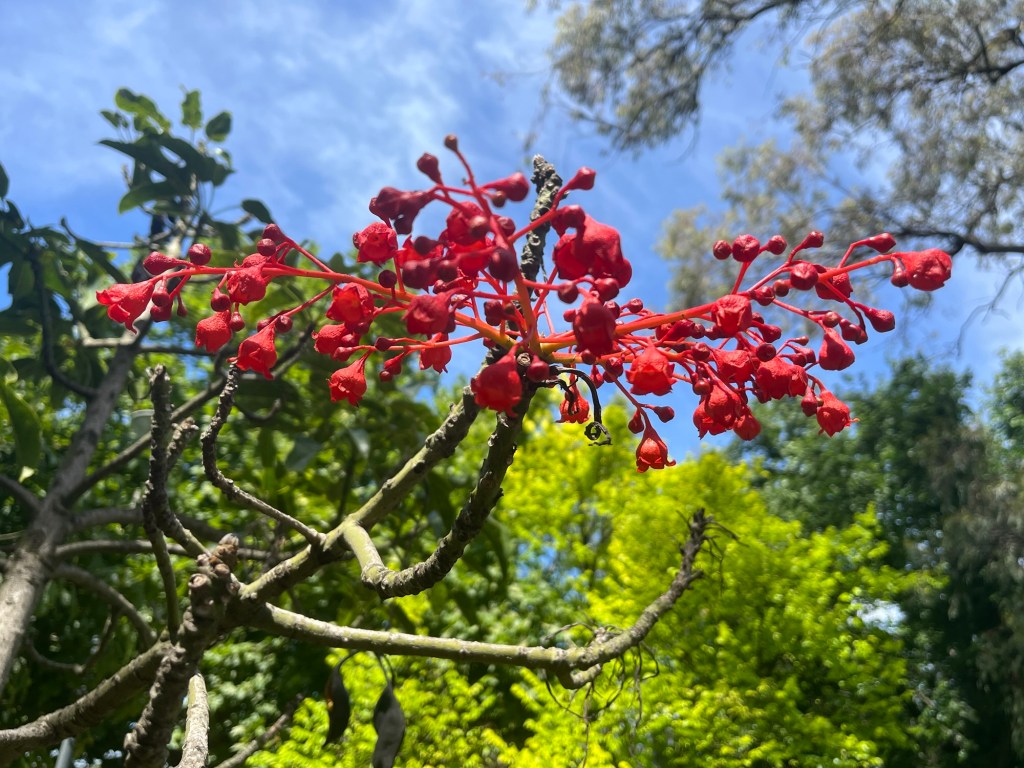 Flame trees (Brachychiton acerifolius), with their vivid scarlet, bell shaped flowers, were rare in Melbourne (Naarm) a couple of decades ago, in fact I can only ever remember seeing one flame tree in the whole of Melbourne when I was growing up. They are much more frequently planted in Melbourne suburbs these days – I wonder if this has anything to do with the warming climate?